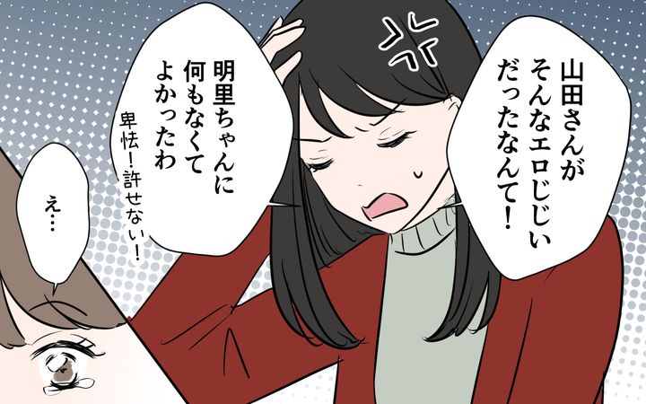 ある時、明里が事務所に一人でいると、コンペを控える大手不動産会社の山田から電話がかかってくる。「競合に話していない、とっておきの情報がある」と言われ、隼人のためになるなら、と待ち合わせのバーへ向かう明里だったが、話は仕事と関係ない内容ばかり。さらには手を握られたり、肩を抱かれたり。明里は思わず山田を突き飛ばしてしまい…。