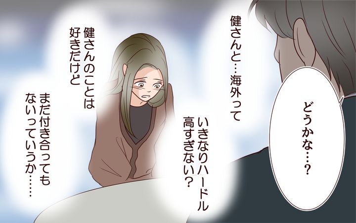 でも離婚直後に他の男性と海外で住むなんて…家族や友人はどう思うだろう?私の今の仕事は?健さんと本当にうまくやっていける?全てを手放してついていくには、リスクが高すぎる。健さんの気持ちは嬉しい!けれど、どうしても素直に喜べずデメリットばかり考えてしまう…。