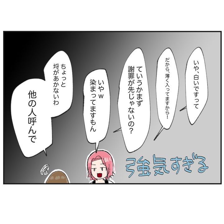 しかしお客様から直接指摘を受けるも、強気で反論するえいこ。「染まっていない」「染まっている」の押し問答の末、えいこは助け舟を求めるのでした。そしてお客様の元へ急ぐと…!?