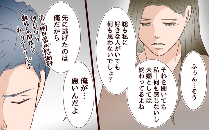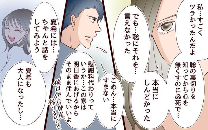 聡は償いとして慰謝料代わりにマンションの名義を私に変更してくれました。さらに聡は誰かと再婚する意志はなく、今後聡に何かあったときに私にも相続の権利がある方がいいのではと提案してくれたので、離婚手続きはしないことにしました。そして、聡は私に別のパートナーがいても問題ないと言ってくれ、私も今後聡に別のパートナーができても…気にならないと思います。そういう意味でも、私たちの夫婦関係は終了したのだと思います。