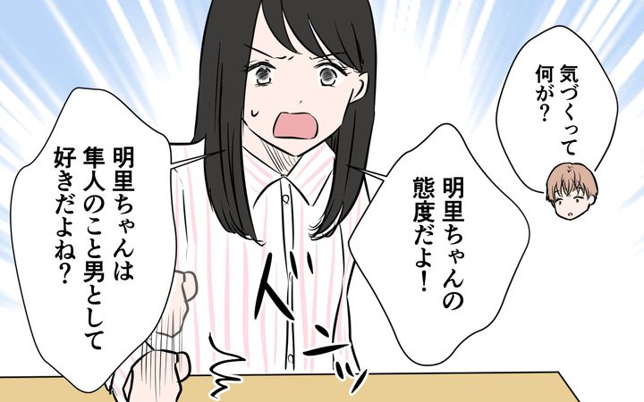 思い切って胸の内を明かしたのに、隼人の対応は冷たいものでした…。なんでわかってくれないの?ここまで鈍感で無神経な人だとは思いませんでした。あんなにわかりやすく挑発してくる明里ちゃんの本性に気づかないなんて…。