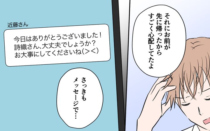 そんな中、詩織と隼人が先輩から周年パーティーに招待される。それを知った明里は、「私も行きたいです!」と猛アピール。パーティー当日は気合いの入ったドレスで現れ、妻気取りの振る舞いを連発する。しかし隼人は何も気づいていないようで、その状況に耐えられなくなった詩織は「気分が悪いから」と先に会場を去ったのだった。
