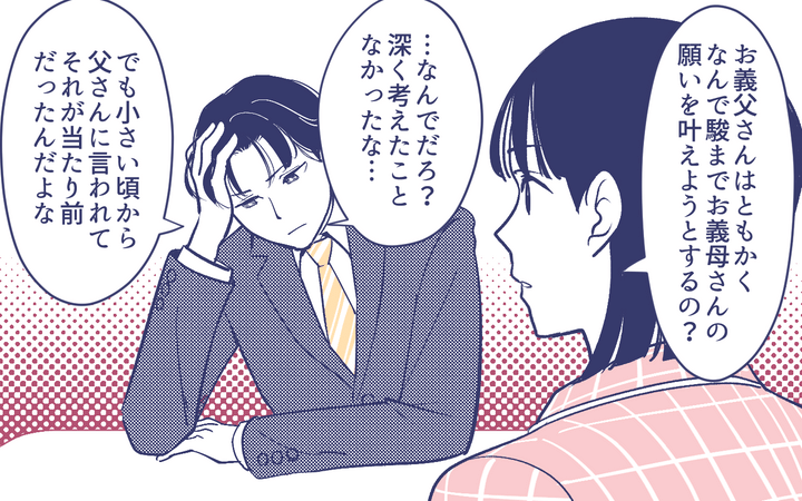 夫がお義母さんの願いを叶えようとしてしまうのは、幼少期からお義父さんに助けるよう言われ続けたから。でも、そもそもお義父さんはなぜお義母さんに何もさせないの? この疑問が問題解決のカギになる気がした私は、入院中のお義父さんに思い切って不躾な質問をしてみたのです。