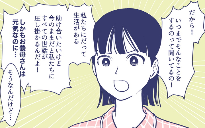 施設を拒むお義父さんの介護をしながら、お義母さんの身の回りの世話をする? 私たちに同居を求め、生活の全てを頼るなんてあり得ない!と私は夫に強く反論しました。義実家に泊まり込み、疲れ切った夫もそれはわかっていたようで…。