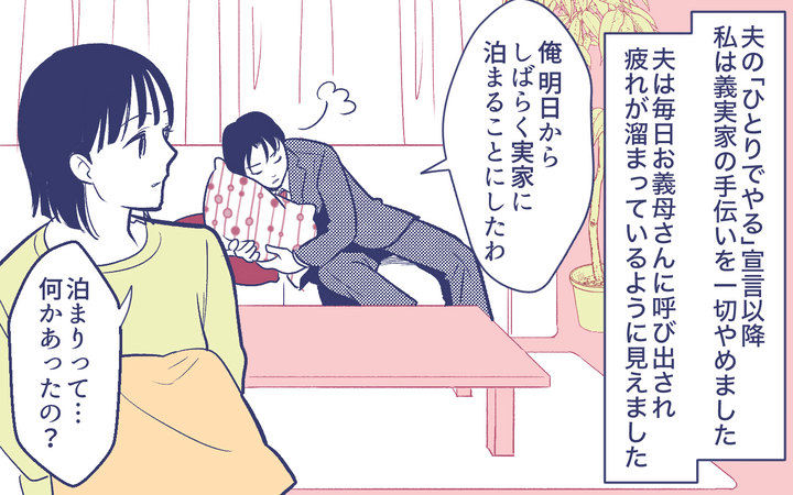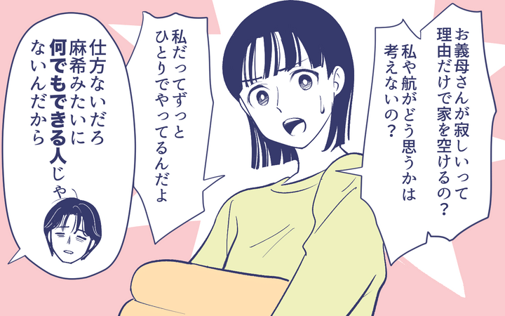 そんな中、もともと予定が入っていた日に義母の手伝いを頼まれた麻希は、義母の前で「どうして私が?」と思わず本音を口にしてしまう。帰宅後、夫から「なんであんなこと言ったの?」と責められた麻希は、あらためて「義母に何もさせないのはおかしい」と訴える。
