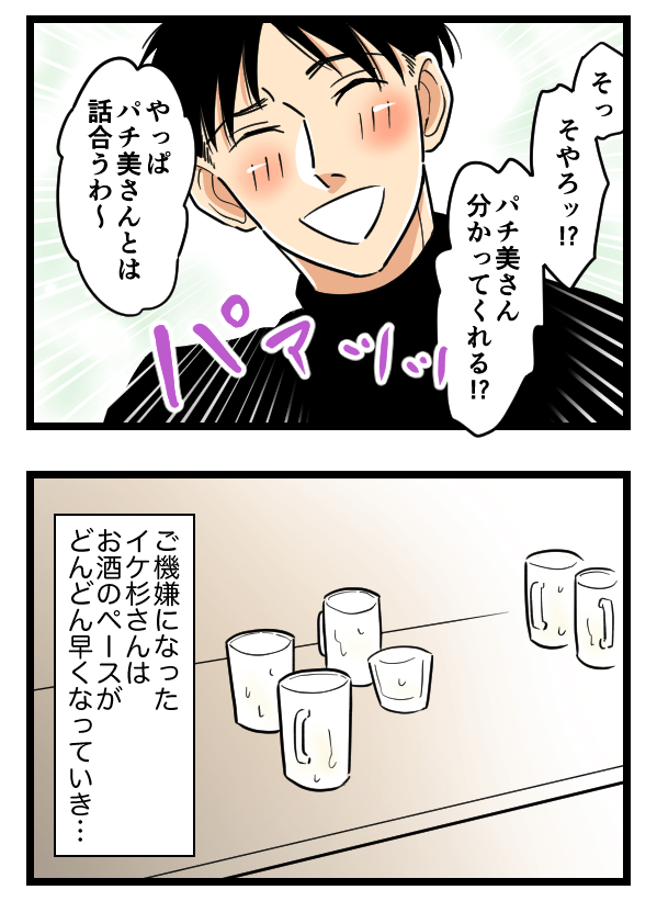 イケ杉の電話が終わったことを確認し、パチ美は「こっちですよ」と声をかける。「遅れてすみません」と謝るイケ杉を見て、パチ美は「かっこいい!」とあまりのイケメンぶりにトキめいてしまう。さっそくイケ杉が予約していた居酒屋へ向かい、乾杯&自己紹介。しかし、SNSのフォロワーが320人いることを自慢げに話してきたり、フォロワー数を増やすテクニックをドヤ顔で説明してきたりと、イケ杉のクセの強さが露呈。すぐに「ヤバい空気」を感じるパチ美だったが…?