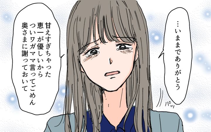 夫の恵一が自分に内緒で地元に帰っていることに気付いた舞子。恵一を尾行すると、地元の病院で元婚約者と会っていた。恵一の元婚約者の葉月は生存率50%以下の病気に侵されていて、恵一は葉月を元気づけようとしていたのだ。もともと恵一と葉月は親の反対で仕方なく別れを選択したが、お互い未練を残していた。葉月の境遇や恵一の正直な気持ちを知った舞子は恵一が見舞いに行くことを認め、「支えてあげて」と伝える。自分の情けなさを実感した恵一は、自分の気持ちを葉月に伝えようと決心する。