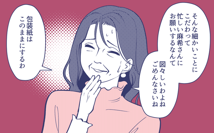 すると義母が、夫が買った“お礼品”の包装紙の色が違う、と言い出す。夫は店に包み直してもらおうと提案するが、明日は仕事。そこで、「代わりに行ってきてくれない?」と麻希に声をかける。しかし、麻希にも息子の予防接種に行く予定があり、「どうして予定を変えてまで、私がやらなきゃいけないの?」と本音を口にして…。