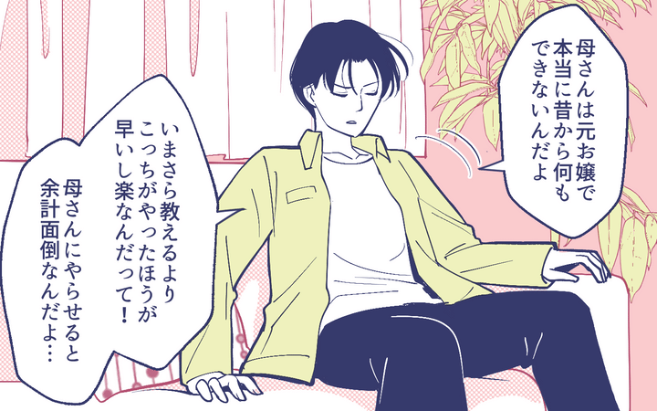 だって、お義父さんも夫もお義母さんに何もさせようとしないから…。元お嬢様で昔から何もできないことは、家事をやらない理由にならないと思うのです。教えるよりやったほうが早くて楽なのはわかりますが、私たちが先に動く限り、お義母さんは人任せで生きていかなきゃいけない…。