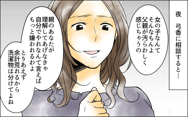 親の心をえぐるような槍のような言葉がこれでもかと降ってきて、心底参っていました。弓香に相談しても「女の子はどうしても父親が汚らしく感じる時がある」と話し、奏を諫めることはしてくれず…。