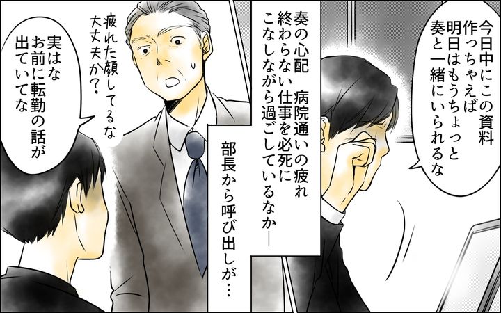 まだ若手の俺に部長が声をかけてくれたことは、本当に嬉しく思っていました。この会社に入ったのならそのプロジェクトは何があっても一番に参加してみたいと思えるものでした。でも奏にとって父親は俺ひとり。昼間に奏の付き添いをする弓香がただでさえ疲れているのに、もしこのプロジェクトに参加してしまったら、さらに弓香に負担がいくのは必至でした。