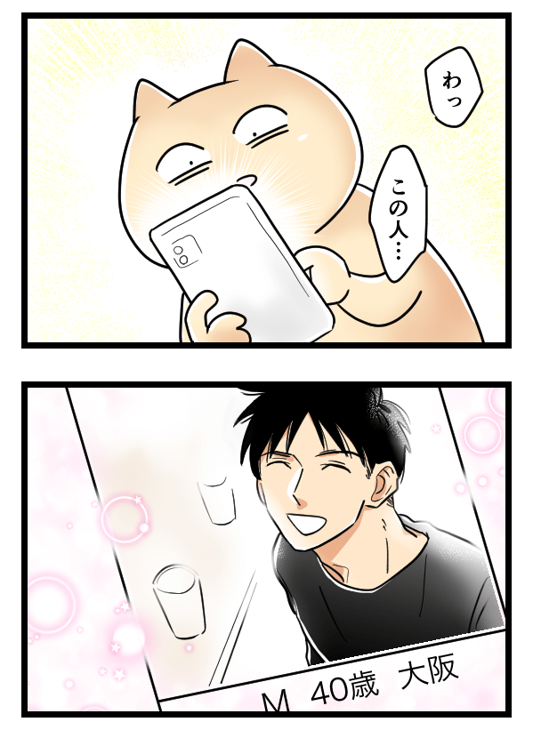 「いいね」をくれた男性の中から、まずは写真と住所でお相手を絞ることに。すると、1人の爽やかなイケメンを発見!タイプの顔ではないけれど、「めっちゃカッコいい!」と心奪われたパチ美さん。いや、これは誰でもテンション上がりますよね。