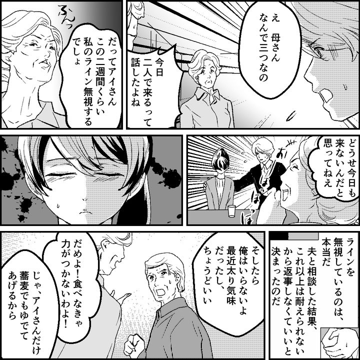 義母と戦う決意をしたアイは、前向きな気持ちで義実家へ。夫は複雑な表情を浮かべていたが、アイはどうか夫と平和な日々が過ごしたいと願うばかりだった。義母宅には、お昼ごはん時に到着。本来なら避けるべき時間だが、アイには“ある考え”があって…。予定時間の5分前だったにもかかわらず、対面した義母は「遅かった」「待ちくたびれた」と、相変わらずのモラハラ発言。さらには「スリッパ出せる?」と夫に場所を尋ね、「当たり前」だという夫に「この家のことなんて忘れちゃったんじゃないかと思った」と返すなど、嫌味を連発する。そうして、昼食の時間になって…。
