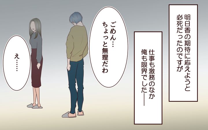 仕事は自分の都合だけで捌けるものではなく、クライアントや先輩からの急な呼び出しなどに振り回されることも少なくありません。常に気を張っていなければならず、家に帰っても明日香の顔色をうかがう毎日に、俺はもう…ギリギリでした。