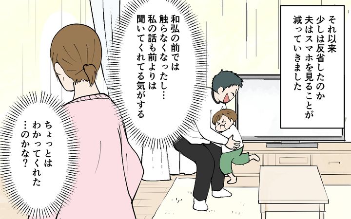 フードコードの一件のあとから、夫はさすがに懲りたのかスマホに触る機会は減っていきました。謝罪の言葉はなかったけれど、大衆の前で怒られたのが効いたのでしょうか…?
