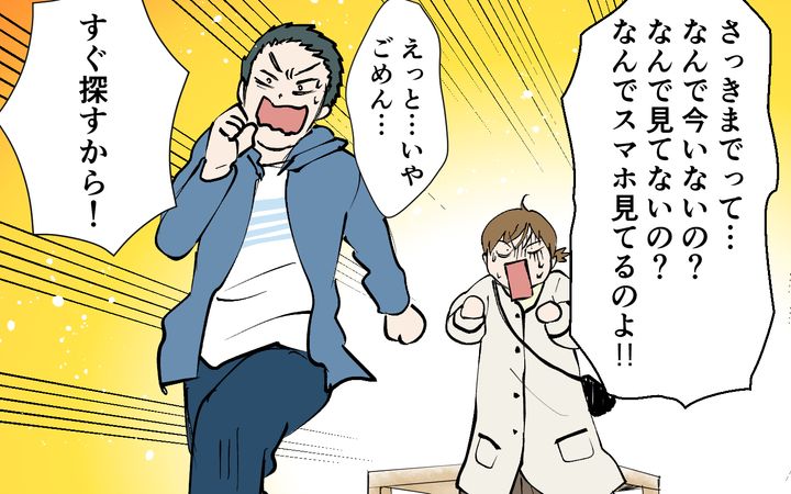 スマホがないと大騒ぎし、子どもが楽しみにしているイベントにも間に合わなかったにも関わらず反省の色はナシ。それでも一緒に出かけようとする夫が不思議でならないのだが、休日に行ったフードコートで息子がこぼしたうどんがスマホにかかっただけで夫は怒り、妻のせいにしてきた。ついに限界に達した妻は「じゃあスマホと結婚したら!?」と声を荒げてしまう。