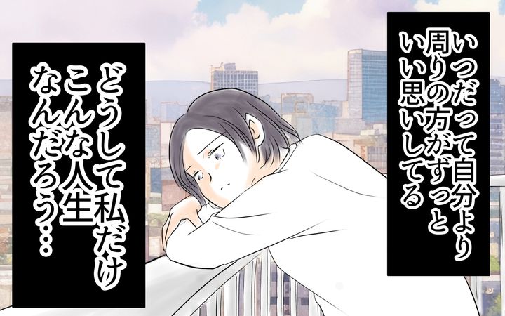 私はいつも気が付くと、低下層にいるような気分になります。私が気づかないうちに、みんなが私を追い越して、私よりも得した人生を送っている…。どうしてもそう思ってしまうのです。私は、どうしてみんなのように幸せになれないんだろう…そんな想いによく囚われます。