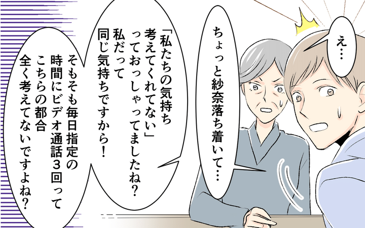 1日3回のビデオ電話がストレスになり、義父母と話し合って適度な距離感を見つけた紗奈。このまま平和な関係を築けそうだと思っていたのだが…。ある日義父母が家に遊びにくることに。すると義父母は、紗奈や悠をまるで自分たちの要求を満たすためのモノだと思っているような言動を繰り返す。その上、彼らは紗奈のいないところで紗奈の悪口を話していて…。