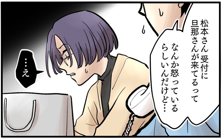 松本の夫への態度は明らかにおかしく、愚痴を言ったかと思えばすぐにフォローしたり。また夫に対する感情起伏が激しく、周囲も松本の対応に困っていた。ある時松本の不安定さを見た上司の七瀬が、松本の夫に原因があるのではないかと考える。