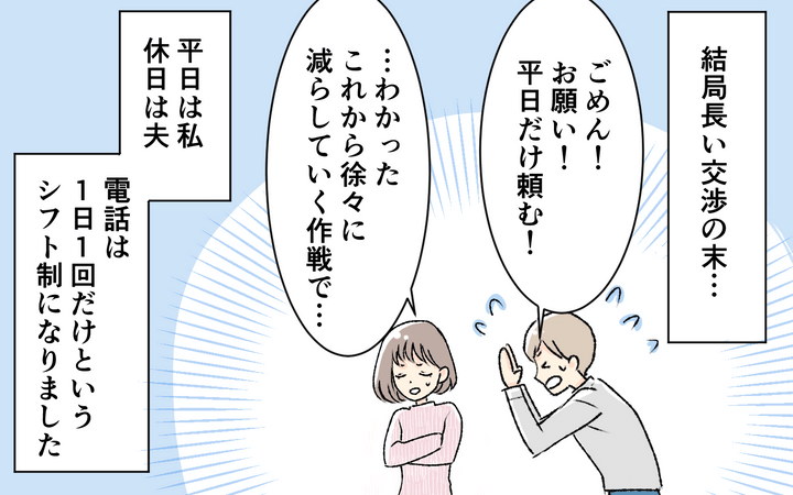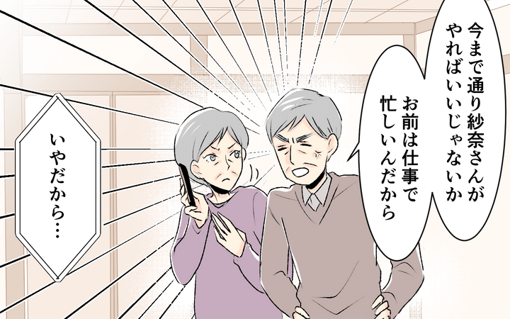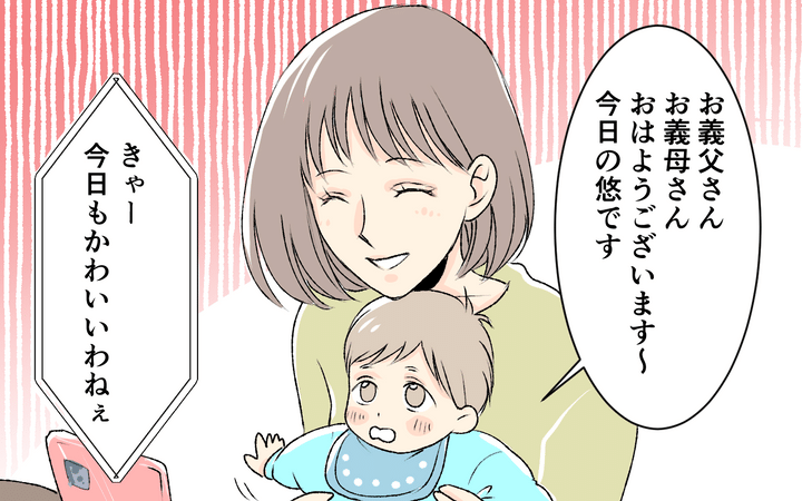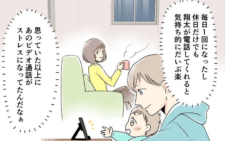 1日3回のビデオ通話を求めてくる義父母にストレスを感じていた紗奈。ある日、悠が体調不良にも関わらず、自分達の欲求のためだけにビデオ電話を強要してきた上、謝ろうとした紗奈を無視するという義父母の行動に限界が来て、「もうビデオ通話しない!今後はあなたがよろしく!」と夫に宣言する。夫は紗奈の言い分に納得し、今後のビデオ通話は夫がやることに。これで一件落着と思っていた紗奈だったが…。