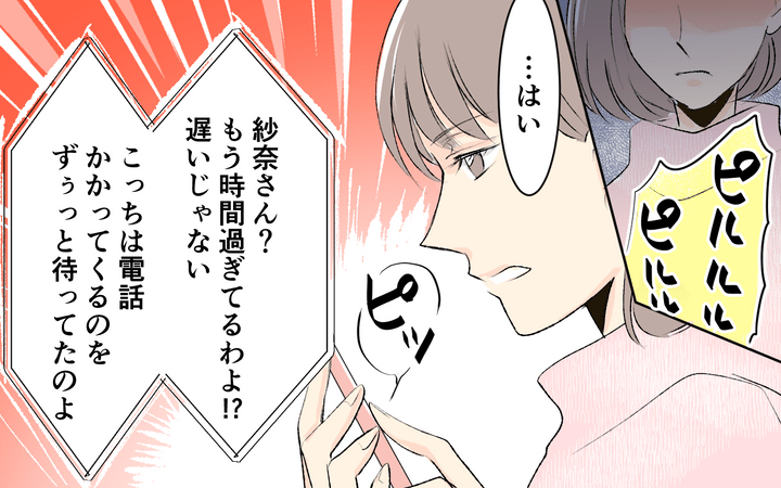 義父母との1日3回のビデオ電話。それは孫の顔が見たいという義父母の愛情ゆえのものだと思い、必死に要求に応えていた紗奈。しかしある日、悠の具合が悪いと伝えたにも関わらず「電話がない」と怒った義父母に対し不信感を持つ。とはいえ夫の立場もあるし…と仲直りをしようと歩み寄る姿勢を見せるのだが、義父母はそんな紗奈を完全無視する。