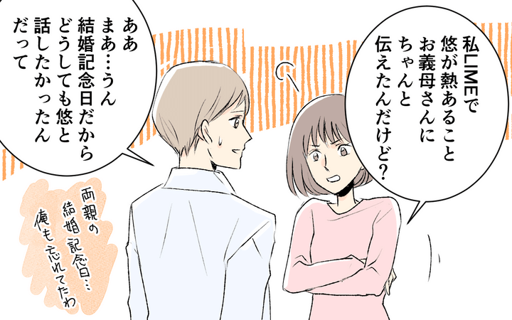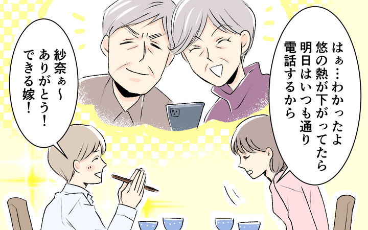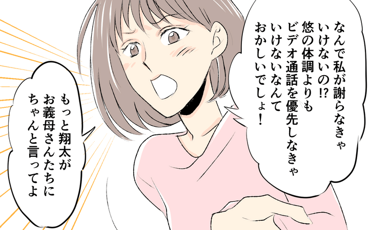 義父母との毎日のビデオ電話を負担に感じつつも、「孫の顔が見たい」という義父母のためになんとか耐えていた紗奈。しかしある日、息子が熱を出したため電話を断ると、夜に電話がかかってきて「どうして今日は電話がないの!」などと責められる。このことで義父母が「息子の体調より自分達の都合を優先している…?」と不信感を持つ紗奈。