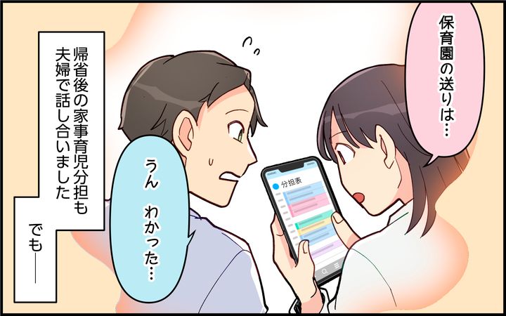翌日、夫は一日遅れで義実家へ。妻の母からガツンと説教され、妻からも「私と息子と一緒にいたくないんだよね?」と問い詰められてしまう。バスケサークルの仲間も育児は妻に任せきりで、自分もそれでいいと思っていたというが、妻はその考えを真っ向から否定。「親としての責任感が足りない」「もう何も信用できない」と夫に本音をぶつけて…。