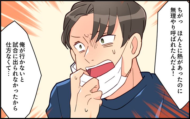 妻の実家へ帰省する日にも、朝から「熱っぽい」と言い出す夫。しかし実際は、バスケサークルの試合&祝勝会に参加。夫は「ここにいるメンバーは全員育児をしていない」と開き直り、これ程度の仮病ならバレることはないと考えていた。