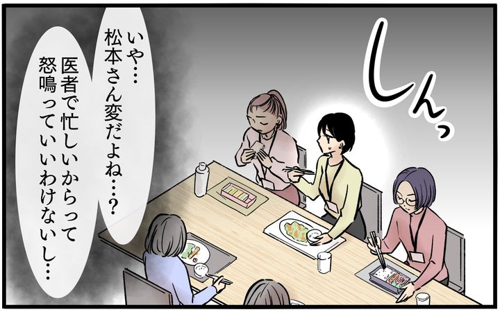 さらに松本の不可解な行動はランチタイムでも起こっていた。これまでは他の社員たちと楽しくお互いの夫の愚痴を言い合っていたのだが…。松本も同じように夫の愚痴は言うものの、その内容に対して志織たちが松本に同情する発言をすると途端に夫をかばい始める。風邪を引いて夫に怒られたと話す松本に同情した社員が「旦那さんがひどい」と話すと、松本は「彼は医者だから体調管理は万全にしないといけない。そんなこともわからないんですか?」と怒り始めて…。