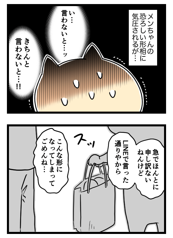 縁切り神社に参拝して以降、パチ美はイケメン彼氏・イケ杉を会う頻度を減らすようになる。その間に、キャラクターグッズなど自分の部屋にあったイケ杉の物を袋に詰めて整理。本当は会って別れ話をしたいと思っていたものの、どうしても顔に黒いモヤがかかったイケ杉を思い出してしまい、仕方なく別れのメッセージを送信する。すると、イケ杉から「説明しろ」「ふざけんな」と返信が。タバコを吸うこと、昼間から酒を飲んで暴れることなど、これまで何度も注意したが改善されなかったことを伝えると、「今からお前ん家に行く」と返ってきて…!?