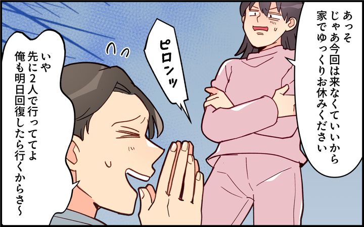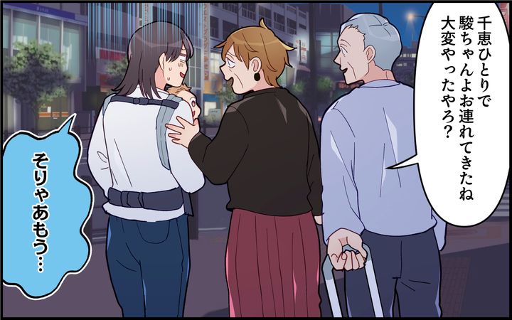 その後、親友に夫の仮病疑惑を相談。「日常を変えようとするのではなく、まずはお盆に予定している大阪帰省の際に育児に参加してもらうのはどうか」とアドバイスを受け、千恵はさっそく実践することに。しかし帰省当日、夫は「熱っぽい」と言い出して…。
