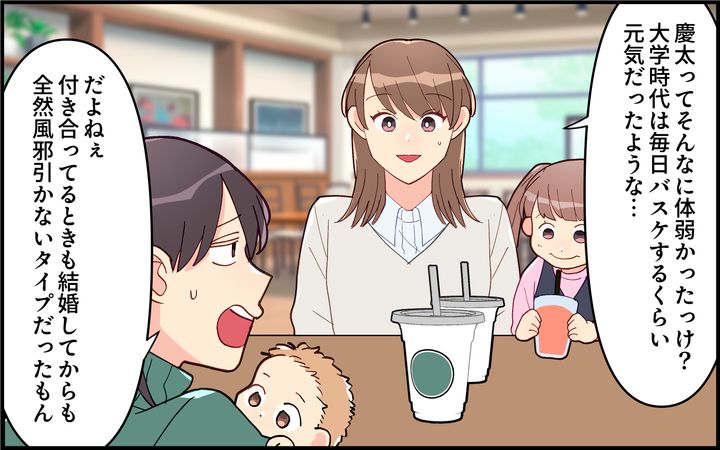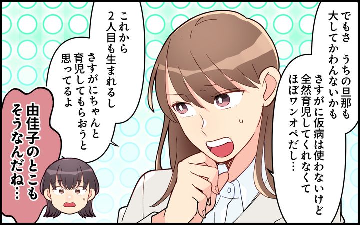 大学時代に同じバスケ部マネージャーだった由佳子は、今はなんでも話せるママ友。お互いに夫への不満は尽きません。特に由佳子は2人目を妊娠していることもあり、今後はしっかりと育児参加してもらうように考えているようです。