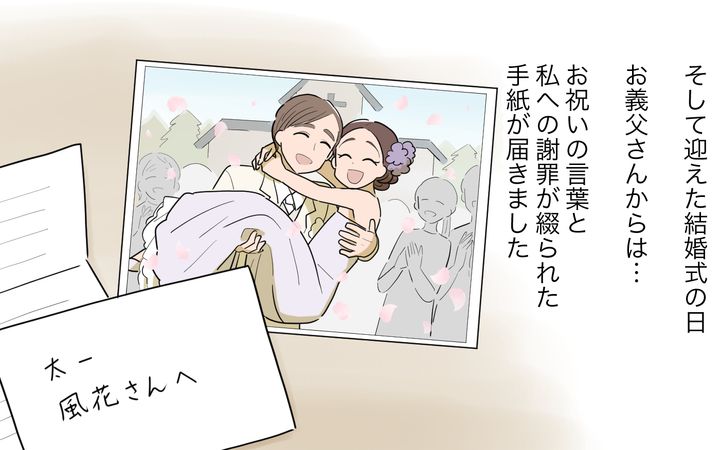 私自身は、しばらくはお義父さんと会うことはないと思います。だけど結婚式に届いた手紙を読んで、お義父さんもちょっとだけ変わろうとしてくれているのかな…と感じるようになりました。