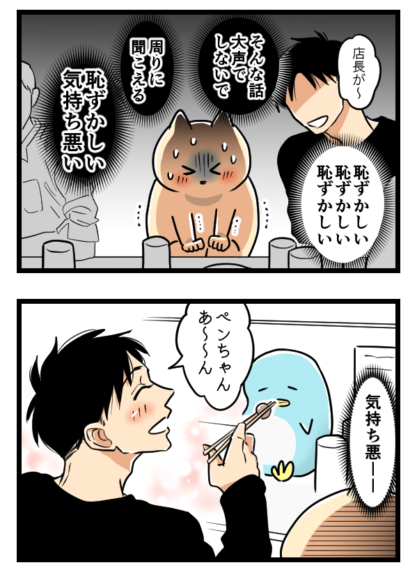 平日だったこともあり、店内はサラリーマンらしきお客さんが多く、「頼むから大声でクッッッッソしょうもない恥ずかしい武勇伝を語らんでくれー!」と思っていたそうです。