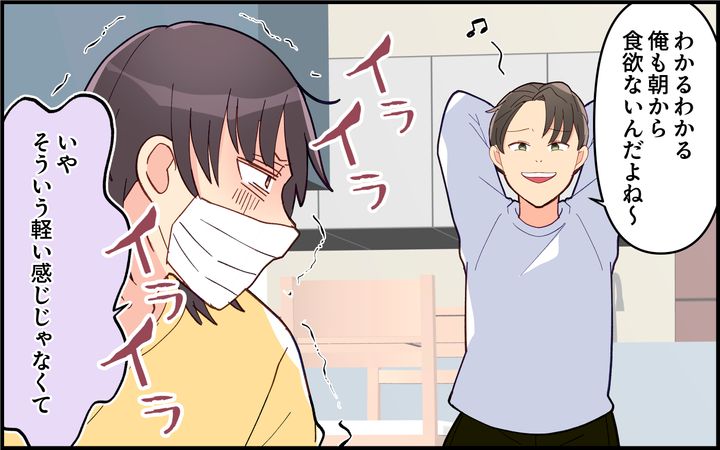 私が体調不良を訴えると、それに乗っかるように軽々しく「俺も具合が悪い」と言う夫にイラッ。私の体調はどんどん悪化するばかりでー。