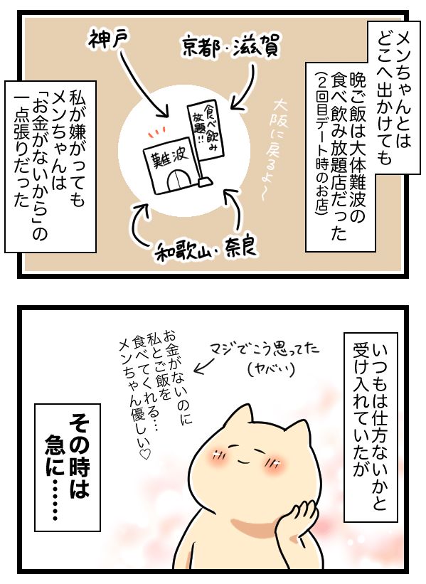 晩ご飯は、よっぽど遠方でなければ毎回難波へ帰っていたというパチ美さんとイケ杉さん。本当はご当地の美味しいご飯も食べたいと思っていたパチ美さんですが、当時は盲目モードだったため、「お金がないのに少しでも長く私と一緒にいたいと思ってくれてるから、受け入れよう」と本気で思っていたそうです。