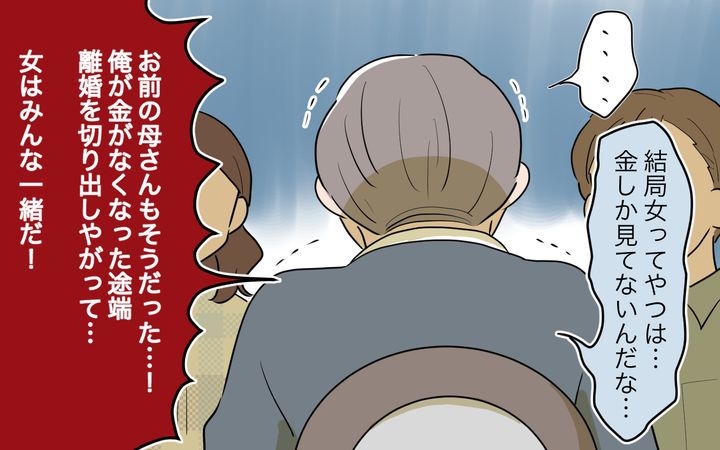 「女ってやつは金しか見ていない」と肩を落とすお義父さん。確かに冴子さんはそうだったかもしれません。だけど、離婚したお義母さんは…?