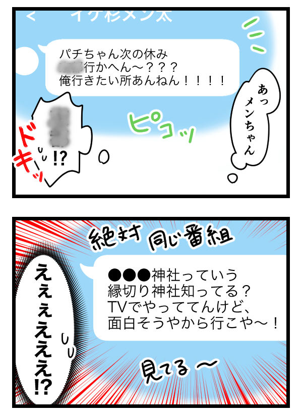 パチ美が別れを決意してから1ヶ月以上。なかなか別れを言い出せないままときが過ぎ、いつしかイケメン彼氏・イケ杉は、昼間のデート中にもお酒を飲むようになっていた。何度か別れを切り出そうとチャレンジしたものの、その美しい顔を見ると言葉が引っ込んでしまい、なかなか前に進めない。そんな中、パチ美はテレビで縁切り神社の特集を目にする。全国から毎日参拝客が訪れるという神社に「これだ!」と感じ、すぐに情報を検索。イケ杉と別れられないのは自分の意志の弱さであり、「こんなことで縁切りなんて」と思いながらも、「別れのきっかけになれば」と次の休みに行ってみる出かけることにして…。