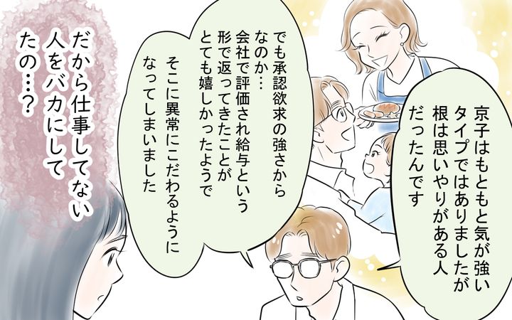 旦那さんの話を聞くと、京子さんは私のような専業主婦だけでなく、旦那さん含め「自分よりも稼いでいない人」を見下していることがわかりました。