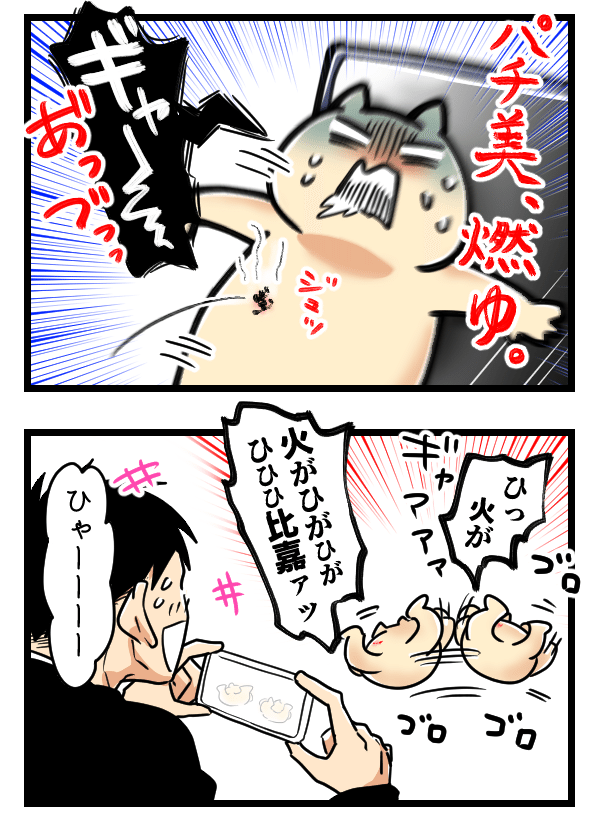 イケメン彼氏・イケ杉は、キャンドル花火を「やってみよう!」と楽しげだが、パチ美は室内でやって大丈夫なのかと心配が止まらない。それでもイケ杉は、SNSでもみんなやっていたから大丈夫だといい、さっそくキャンドルに火をつける。すると、キャンドルからバースデーソングが流れ、小さめの火とともにゆっくりと回り始める。このくらいの火力なら大丈夫だろうと安心したのも束の間。そのスピードはぐんぐん速くなり、火力も増していく。すると、パチ美の嫌な予感は的中し、長年愛用してきたテーブルに火の粉が飛んで焦げてしまう。それでもイケ杉は、笑いながら動画を撮影していて…。