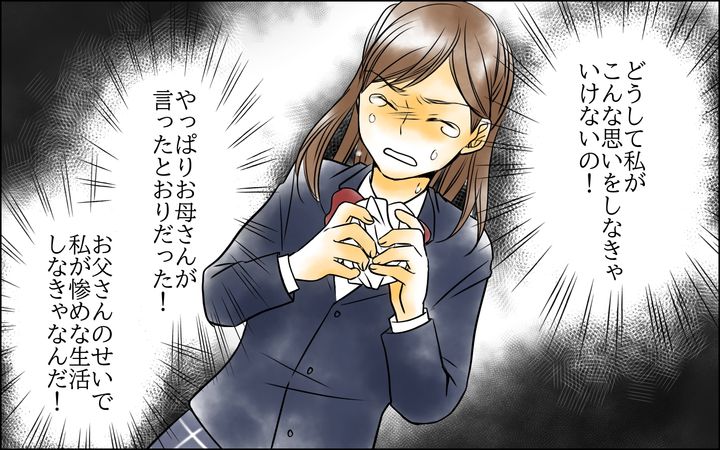 しかし弓香は、奏の夢を叶えるために相談に乗るのではなく、すべて俺のせいにして奏の希望を断っていたようです。曰く、「自分が学生の時に夫によって進路を邪魔された」、「実家から豊富な援助があると騙されて結婚してしまった」、「結婚してみたら、夫に能力がなく給与が低い」、「実家からの援助を自尊心で断ってしまった」、「給料を夫が勝手に使い、妻や娘にはお金をかける気がない」などなど…。