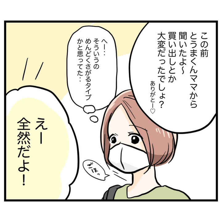 たまたま保育園のお迎えの時に会ったみかちゃんママにお茶に誘われた主人公。しかしその日は予定がありお断りすることに。するとみかちゃんママは「誘ってあげたのに」と言いたそうな様子で「おつかれさま」と会話を切り上げたのでした。それからしばらくして娘が、みかちゃんママが主人公のことを「過保護」と言っているのを聞きます。みかちゃんママに苦手意識を覚えるも、懇親会で話せば分かり合えると考える主人公。しかし、懇親会の前日、体調を壊してしまったのでした。