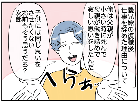 さらに義兄嫁は、自分が産後仕事に復帰すると、義兄が仕事をやめてきたと衝撃発言。無職にもかかわらず、家事も育児もいい加減。その事実を知った夫は、顔色を変えて…。