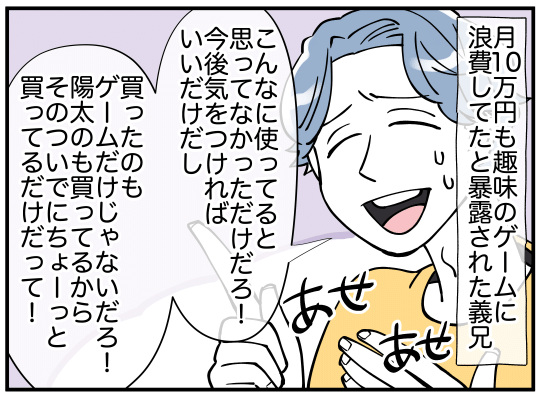 一方、義兄嫁から今までどんな相談をされたのか教えてほしいと頼まれたライコミは、「嫁が家事も育児も丸投げ」などと、これまでに聞いた話を正直に打ち明ける。慌てて反論する義兄だったが、嫁から今月だけでゲームに10万円以上使っていることを指摘されて…。