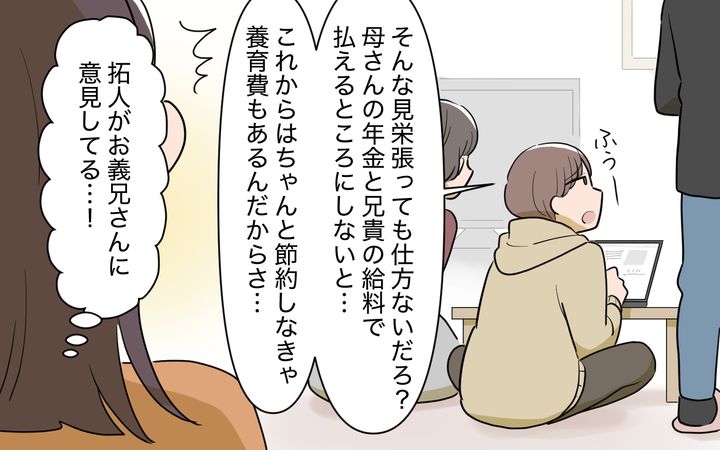 正直、拓人が頼りなさすぎる面が一番の不安の素ですが、強気で思ったことを口に出しやすい私と優しい拓人の相性は良いと思っているので、これ以上義実家に振り回されたくないというのが正直なところ。特に今回のことでお義母さんたちが職業を貴賎しながらも、都合よく使いたい気持ちがよくわかったので、そういう人とは距離を置こうと思っています。