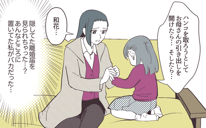 それからというもの、娘の機嫌は悪くなり、美穂や夫にも強く当たるように。“娘が離婚届を見てしまった”という事実を知らない美穂は、「反抗期?」などと考えるが、ある時、娘から「お願いだから離婚しないで」と懇願されて…。