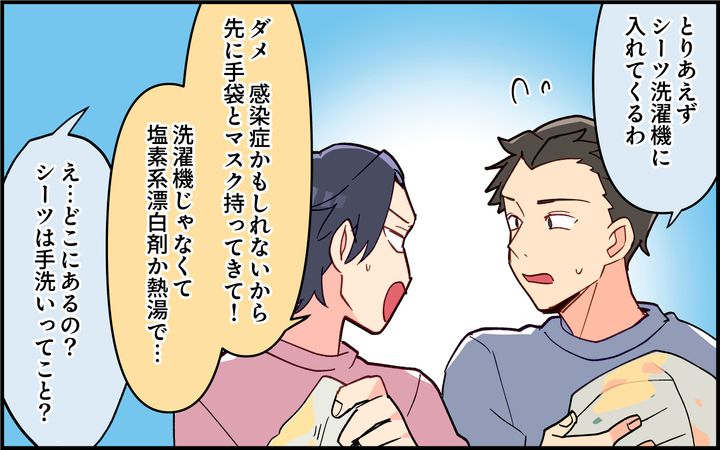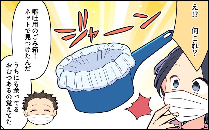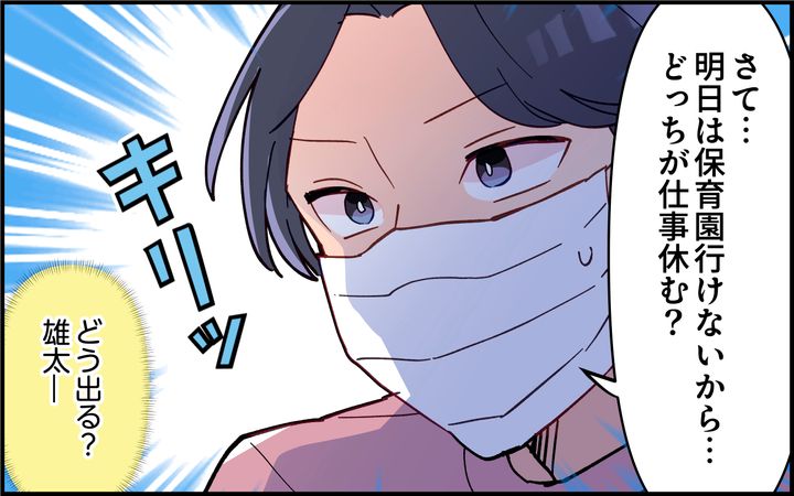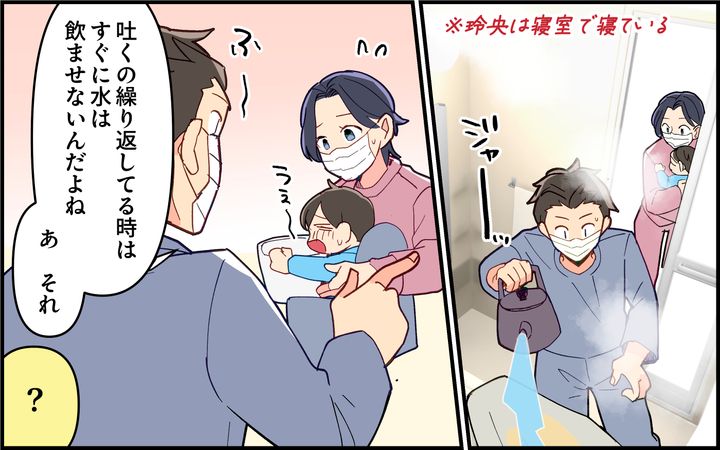 いつも妻の加奈に子どもたちの看病を任せきりにして自分は仕事を休まない雄太。手伝うことがあっても加奈に頼りっぱなしだった。自分もインフルエンザなのに雄太に頼られて辛い思いをした加奈は、同僚から夫向けマニュアルを作成することを勧められる。子どもたちが病気になった時の連絡先や手順を描いたマニュアルを見た雄太は「これなら自分でもできる」と言う。その2週間後、息子に異変が…。まさか、保育園で流行しているノロ…!?