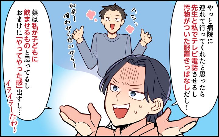 仕事を早退して息子を病院へ連れて行ってくれたことには感謝しますが、診察中も私がテレビ電話で受け答えして、薬を飲ませるのも、ご飯を作るのも私。