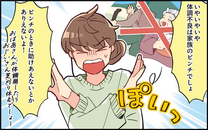 息子がインフルエンザになったが、雄太は仕事が忙しいことを言い訳に、いつも通り妻に看病を任せて出社していた。そのうち妻ともうひとりの子どもも感染し、妻からのSOSの電話を受けて帰宅する。妻に保険証のありかや病院の連絡先を聞いて子どもたちを病院に連れて行った。帰ると妻にオムツがなかったと文句を言い、片付けも任せきりに。さらに子どもに薬を飲ませる方法を妻に聞くと、人任せにしすぎだと叱られた。雄太は仕事の合間にせいいっぱいやっているのに、なぜ嫌味を言われるのかと怒りを爆発させる。