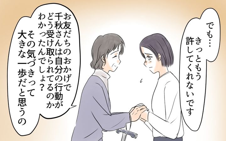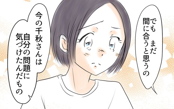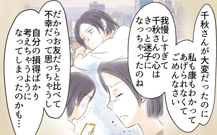 家事育児を一切してこず、生活費を満足にもらえなかったことで、自分のツラさをママ友にぶつけてしまったと理解した千秋は、夫に憤りを表す。そんな千秋の肩を義母が持ってくれる。なぜ千秋の頼みを聞けないのかと義母に聞かれ、夫は早くに結婚したから遊ばないと損している気がすると答えた。その答えを聞き、千秋は「私たちは似たもの夫婦」と笑うのだった。